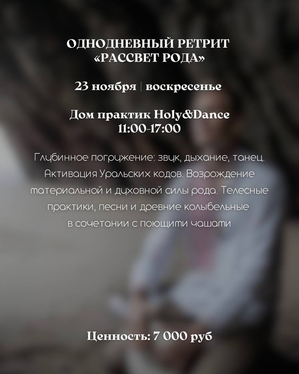 ОДНОДНЕВНЫЙ РЕТРИТ «РАССВЕТ РОДА» 23 ноября | воскресенье Дом практик Holy&Dance 11:00-17:00 Глубинное погружение: звук, дыхание, танец. Активация Уральских кодов. Возрождение материальной и духовной силы рода. Телесные практики, песни и древние колыбельные в сочетании с поющими чашами