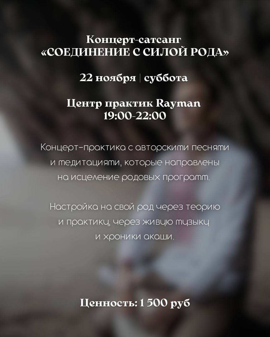 Концерт-сатсанг «СОЕДИНЕНИЕ С СИЛОЙ РОДА» 22 ноября суббота Центр практик Rayman 19:00-22:00 Концерт-практика с авторскими песнями и медитациями которые направлены на исцеление родовых программ. Настройка на свой род через теорию и практики, через живую музыки и хроники акаши.